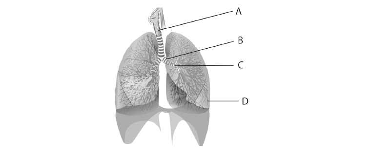 The image shows a section of the human respiratory system. Which letter identifies a bronchiole?