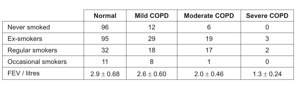 The table shows the numbers of individuals in each COPD class and their mean FEV for a Swedish study of 349 people.