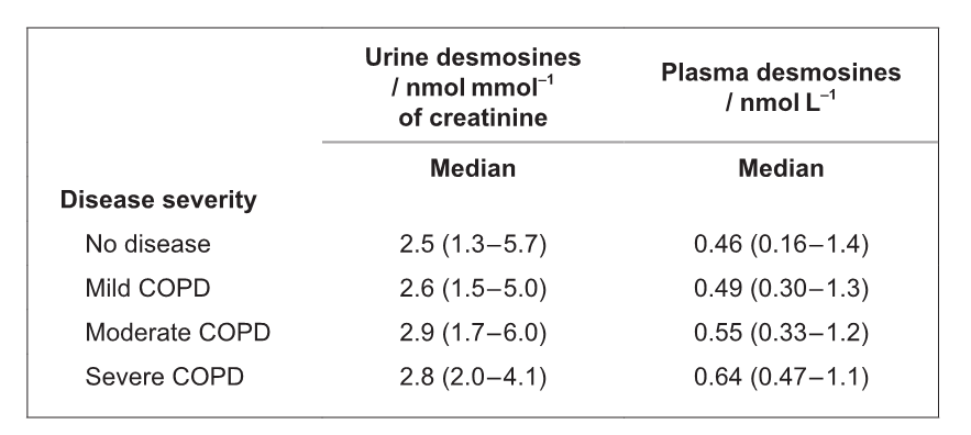 Desmosines in urine or blood plasma have been proposed as biomarkers of lung degradation. The relationship between urine desmosines, plasma desmosines and COPD severity in patients was assessed.