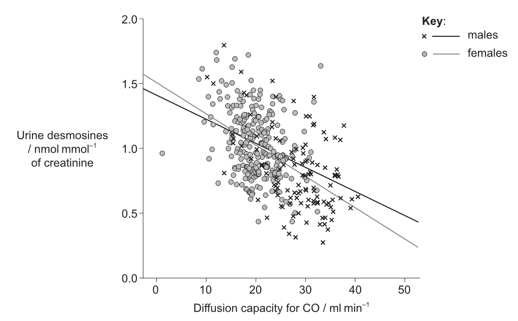 The graph shows the relationship between the diffusion capacity of the lungs for carbon monoxide (CO) and urine desmosines.