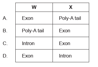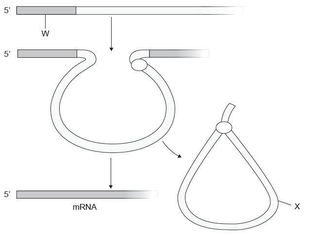 The diagram shows how pre-mRNA is processed into mature mRNA. Which structures are indicated by the letters W and X?