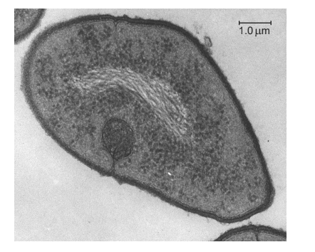 What is a feature of transcription in the single-celled organism shown in the electron micrograph?