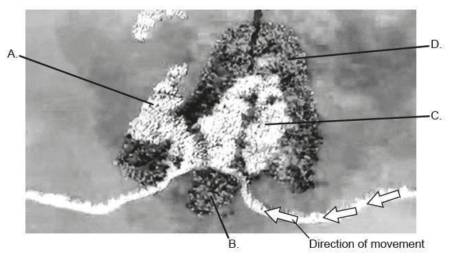 This image is taken from a visualization of a eukaryotic ribosome. The arrows show the direction of movement of mRNA. Which letter represents a tRNA exiting from the E site?