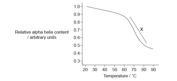 Scientists have heated a solution containing the protein albumin and measured its relative alpha helix content, shown on the graph.
