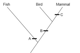 Using the cladogram, identify one diagnostic feature that characterizes the given groups of vertebrates at A, B and C.