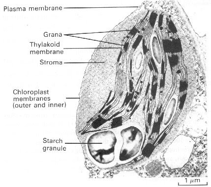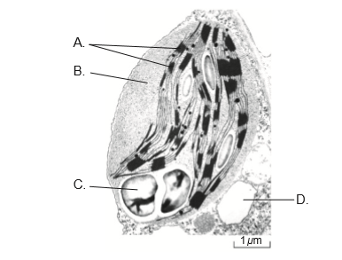 The electron micrograph shows part of a plant cell. Where do the light-independent reactions of photosynthesis take place?
