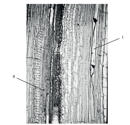 In the tissue labelled I, the movement of materials is the result of transpiration. Transpiration is the process by which water is lost from the leaves of a plant. This loss of water creates a negative pressure gradient that pulls water and dissolved minerals up from the roots and into the stem. This process is known as the transpiration stream, and it is driven by the difference in water potential between the soil and the leaves. As a result, the concentration of solutes is higher in the tissue labelled I than in the tissue labelled II.