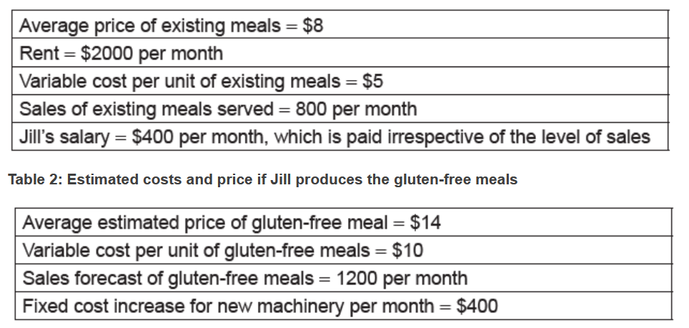 the forecast profit or loss if Jill decides to make and sell gluten-free meals (show all your working).