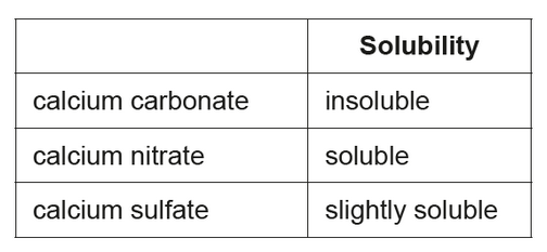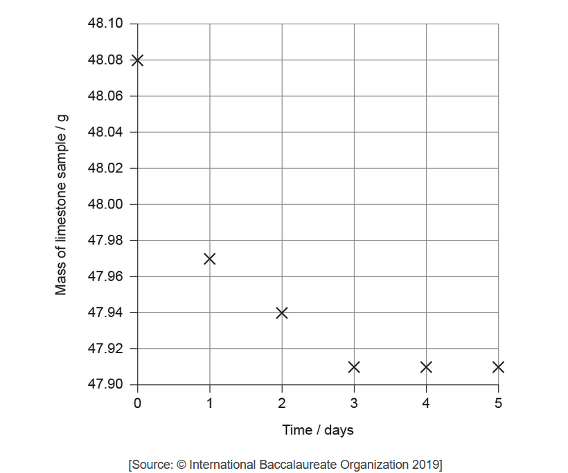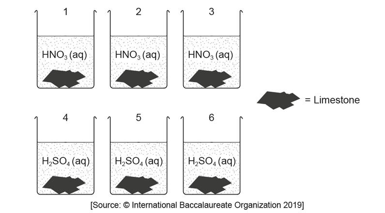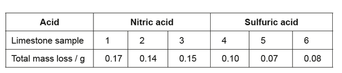 The student monitored the mass of six similarly sized pieces of limestone. Three were placed in beakers containing $200.0 \mathrm{~cm}^3$ of $0.100 \mathrm{~mol} \mathrm{dm}^{-3}$ nitric acid, $\mathrm{HNO}_3(\mathrm{aq})$, and the other three in $200.0 \mathrm{~cm}^3$ of $0.100 \mathrm{~mol} \mathrm{dm}{ }^{-3}$ sulfuric acid, $\mathrm{H}_2 \mathrm{SO}_4$ (aq).