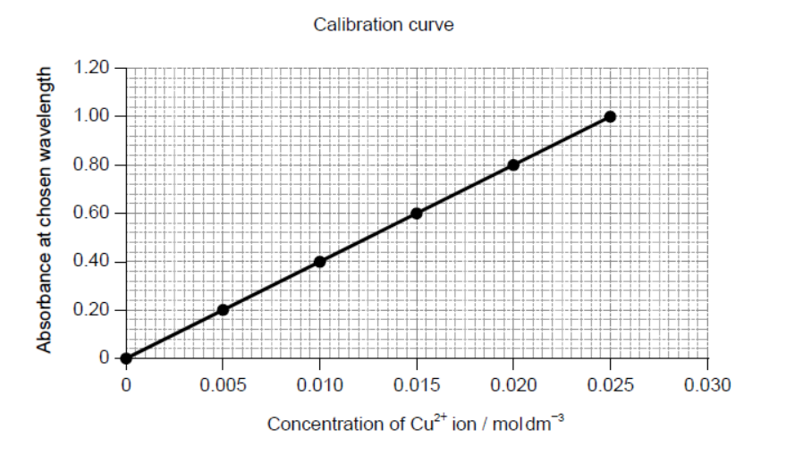 The concentration of copper(II) ions in the resulting solution is then determined from a calibration curve, which is plotted by measuring the light absorbance of standard solutions.