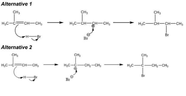 (a) Sketch the mechanism for the reaction of 2-methylbut-2-ene with hydrogen bromide using curly arrows. [3]