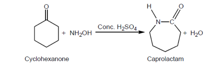 One reaction to convert cyclohexanone to caprolactam using concentrated sulfuric acid as a catalyst is shown.