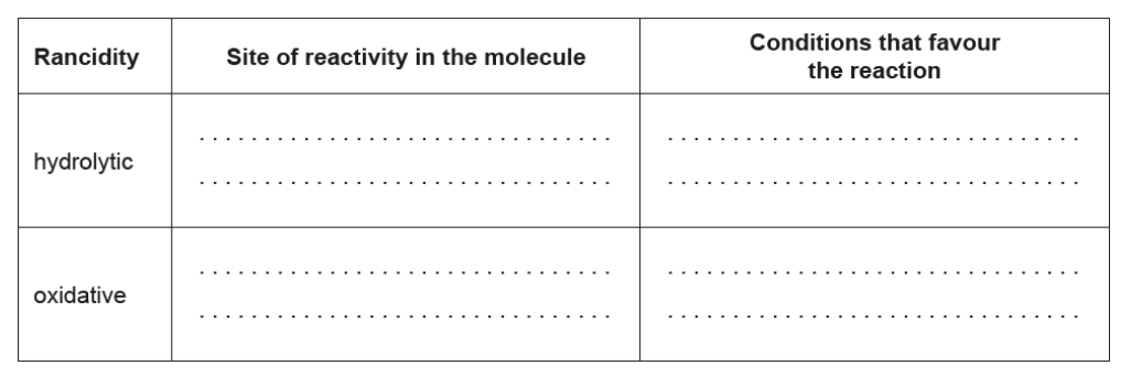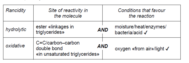 b. The chemical change in stored fats causes rancidity characterized by an unpleasant smell or taste. Compare hydrolytic and oxidative rancidity.