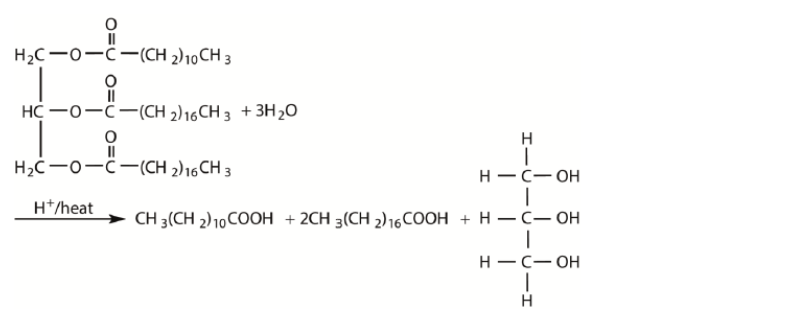 b. Fats contain triglycerides that are esters of glycerol and fatty acids. Deduce an equation for the acid hydrolysis of the following triglyceride.