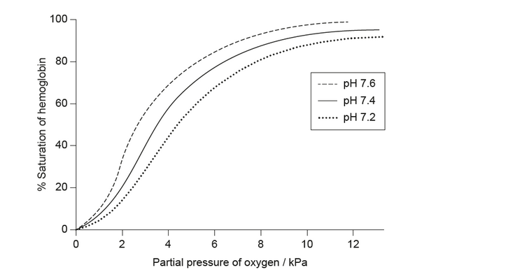 Explain the effect of changing pH on the percentage saturation of hemoglobin at a given partial pressure of oxygen.