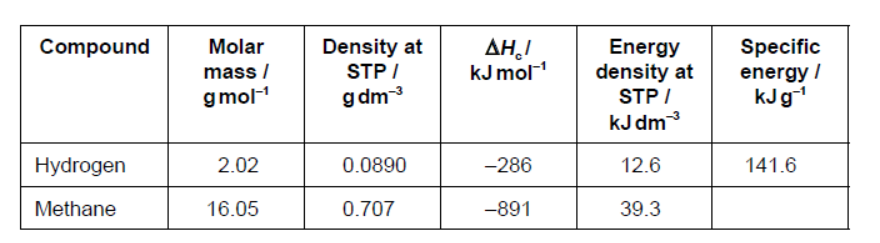 energy density «\(\frac{{{\text{energy released}}}}{{{\text{volume consumed}}}}\) = specific energy × density = 47.9 kJ g–1 × 0.703 g cm–3» = 33.7 «kJ cm–3 »