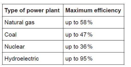 Natural gas is burned to produce steam which turns turbines in an electricity generating power plant. The efficiency of several sources for power plants is given below.