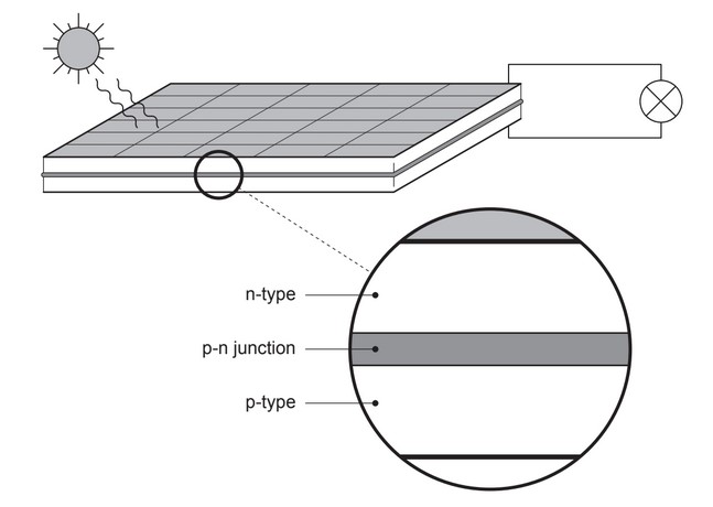 «sunlight produces» free electrons that flow between layers «from p-type to n-
