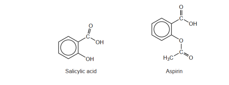 Aspirin is formed by reacting salicylic acid with ethanoic anhydride. The structure of aspirin is given in section 37 of the data booklet.