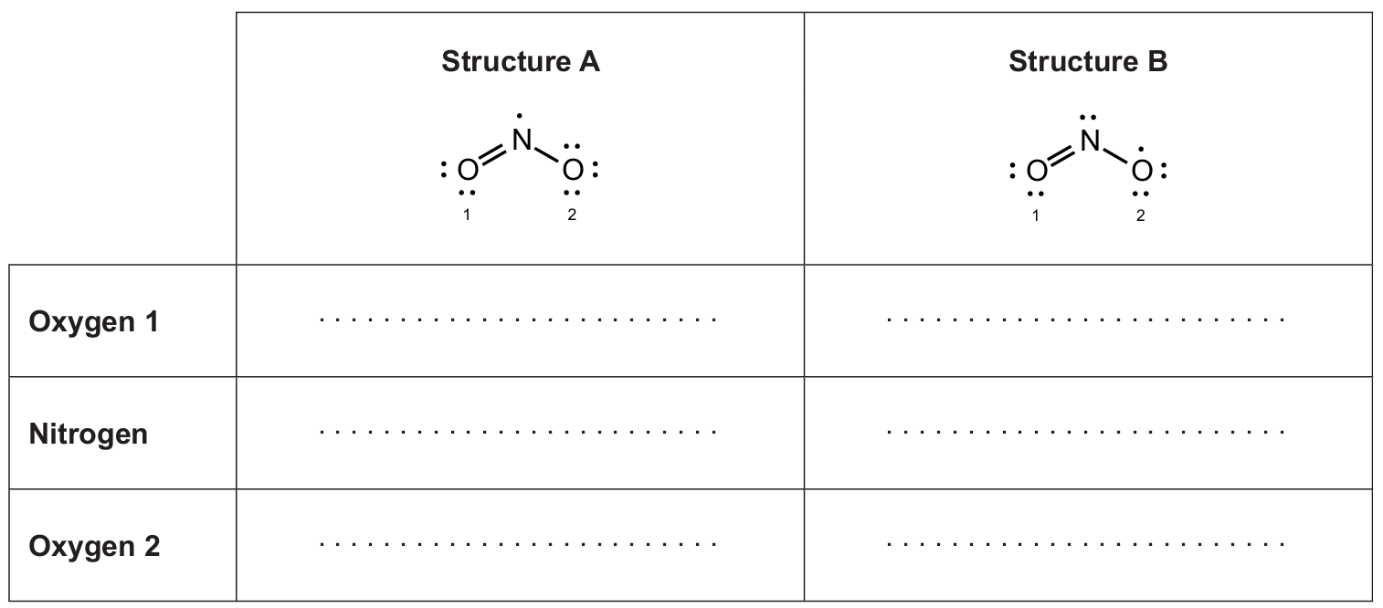 (iii) Calculate the formal charge on each atom in the two Lewis structures of the \(\mathrm{NO_2\cdot\ (g)}\) radical. [\(\,1\,\)]