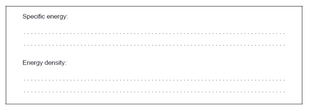 Specific energy: «\( = \frac{{12\,000{\text{ kJ}}\,{\text{mo}}{{\text{l}}^{ – 1}}}}{{299{\text{ g}}\,{\text{mo}}{{\text{l}}^{ – 1}}}}\)» = 40.1 «kJ g−1»