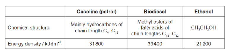 Determine the specific energy, in kJ\(\,\)g−1, and energy density, in kJ\(\,\)cm−3, of a particular biodiesel using the following data and section 1 of the data booklet.