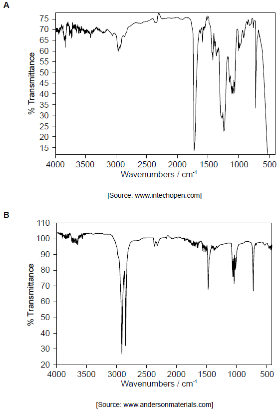 One of the two infrared (IR) spectra is that of polyethene and the other of polytetrafluoroethene (PTFE).