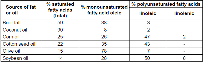 The table below shows average figures for the percentage fatty acid composition of some common fats and oils.