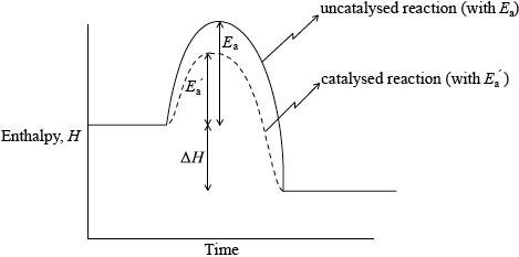 correct position of \({E_{\text{a}}}\) shown with lines for a catalysed and uncatalysed reaction;