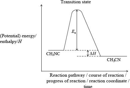 correct position of \(\Delta H\) and \(H{\text{(C}}{{\text{H}}_3}{\text{NC)}}\)/reactant line above \(H{\text{(C}}{{\text{H}}_3}{\text{CN)}}\) product line;