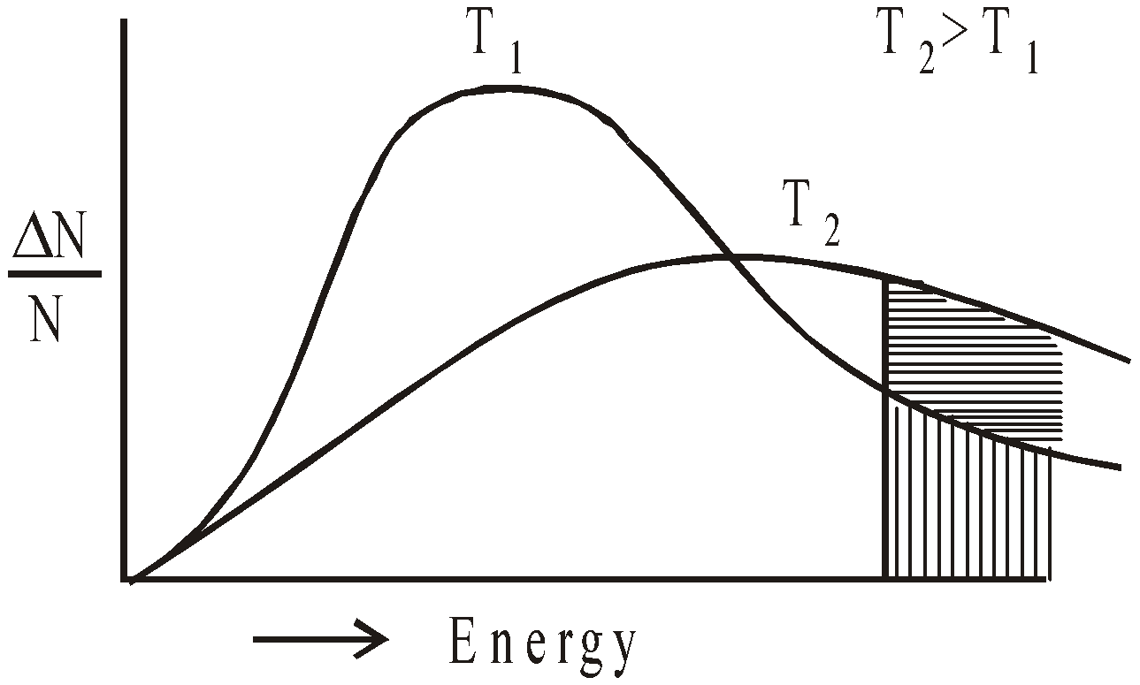 Fraction of the molecules having energy equal to activation energy is shown by shaded portion. The fraction of such molecules become almost double for 10°C rise of temperature and the rate of reaction almost doubles for 10°C rise of temperature.