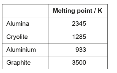 b(ii)Write half-equations for the electrolysis of molten alumina using graphite electrodes, deducing the state symbols of the products.