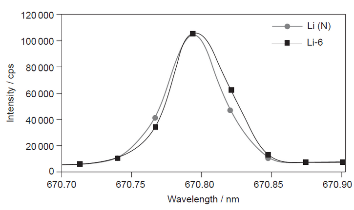 \text { The emission spectra obtained by ICP-OES for a mixture containing the isotope }{ }^6 \mathrm{Li}(\mathrm{Li}-6) \text { and naturally occurring lithium (Li (N)) is shown. }