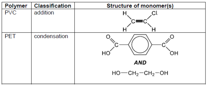 c. Classify PVC and polyethene terephthalate, PET, as addition or condensation polymers and deduce the structural formulas.