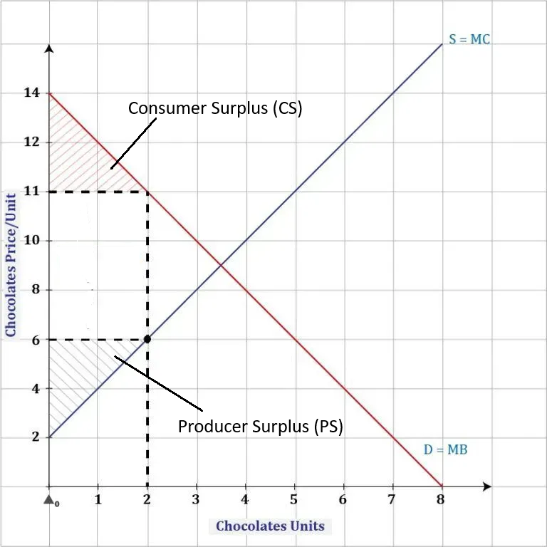 - Market quantity exchanged: Q = 2 units