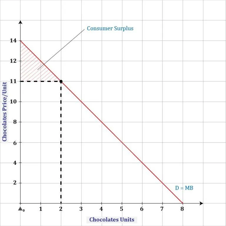 Consumer surplus is the area above the price consumers pay and below the demand (MB) curve, from Q = 0 to Q = 2.