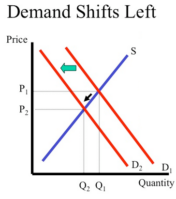 - Demand curve shifts left.