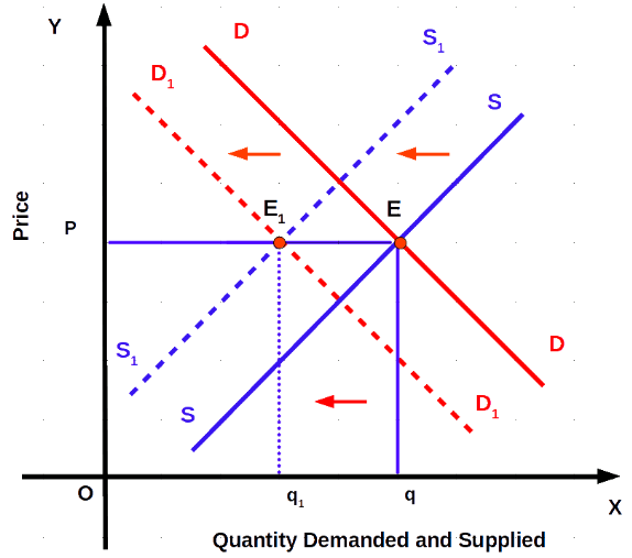 Case 2: Both Demand and Supply Decrease (Leftward Shifts)