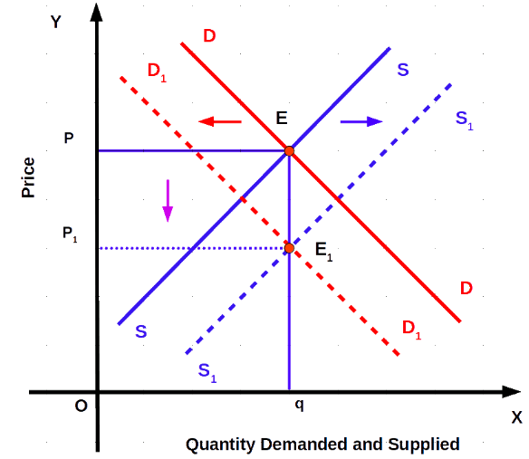 D ↓ & S ↑ → Price ↓, Q uncertain