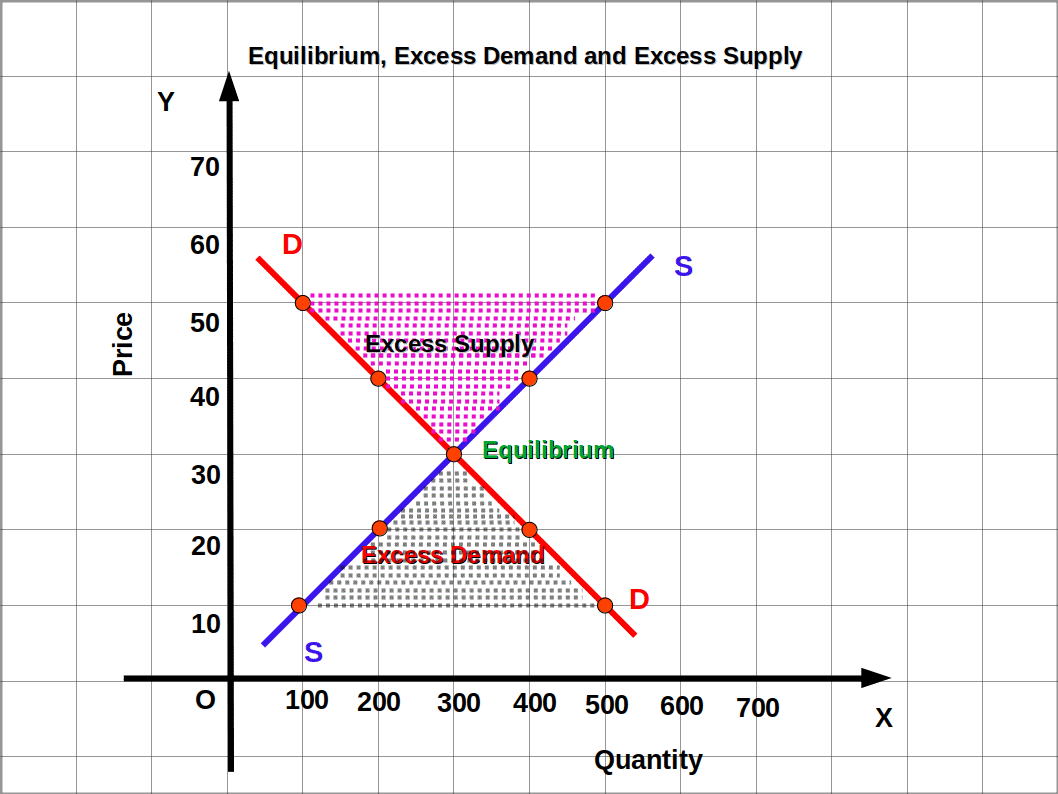Shifting the demand and supply curves to produce a new market equilibrium, with reference to excess demand (shortage) and excess supply (surplus)
