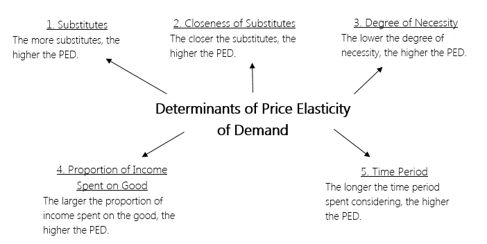 The price elasticity of demand (PED) depends on several key factors that influence how responsive consumers are to price changes. These determinants explain why some goods have elastic demand while others are inelastic.