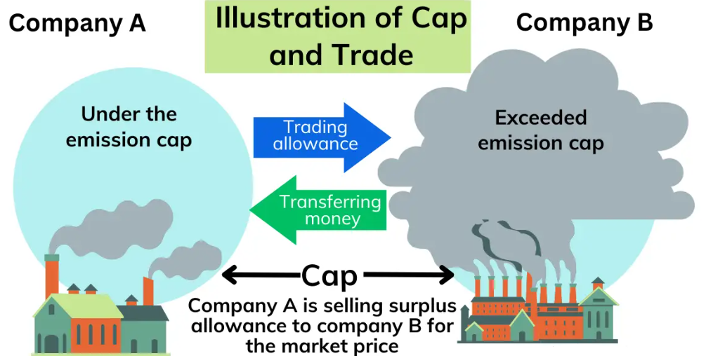 A system where the government sets a limit (cap) on total pollution and issues permits that can be bought and sold.