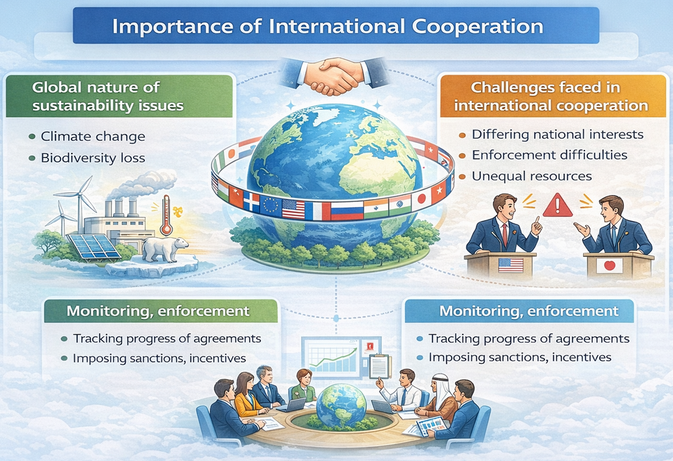 Many environmental and sustainability issues are global in nature, meaning that actions in one country affect others. Problems such as climate change and resource depletion involve cross-border externalities, making international cooperation essential to achieve: