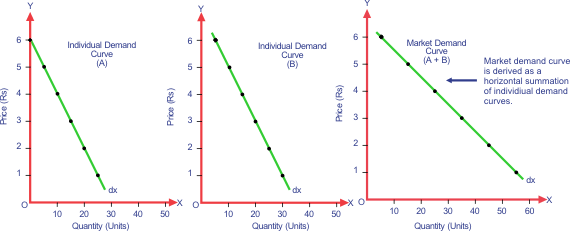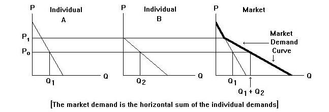 - Market demand is derived through horizontal summation of all individual demand curves.