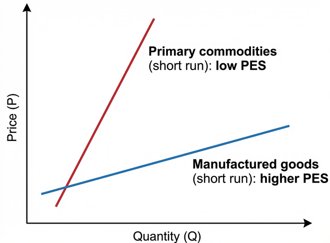 Primary commodities have low PES because production is constrained by time, nature, and limited flexibility. In contrast, manufactured goods have higher PES due to greater control over production and resource allocation.