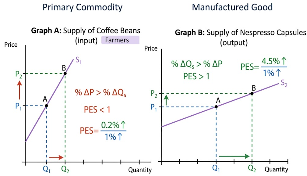 The price elasticity of supply (PES) for primary commodities (e.g. agricultural products, raw materials) is generally lower (more inelastic) than for manufactured goods.