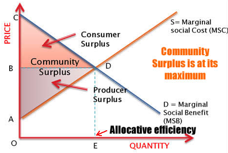 (MSB = MSC): Allocative Efficiency and Social/Community Surplus Maximized