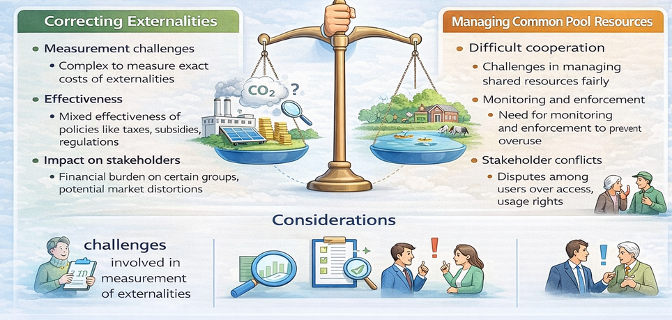 Strengths and limitations of government policies to correct externalities and approaches to managing common pool resources including: