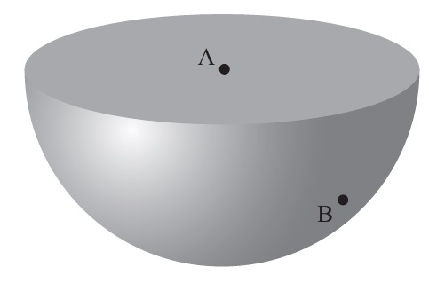 The diagram shows a solid hemisphere with centre \( A(6,-1,-3) \). Point \( B(4,-5,-9) \) lies on the curved surface.