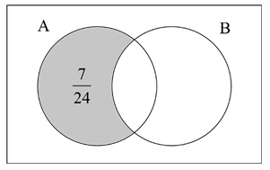 \( P(B) = \dfrac{15}{24} – \dfrac{7}{24} = \dfrac{8}{24} = \dfrac{1}{3} \).